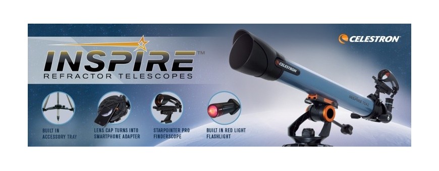 Se state cercando un telescopio performante, che abbia una montatura stabile, leggera e completa di porta oggetti e che sia facile da usare anche nelle notti più buie allora la gamma INSPIRE è la scelta che fa per voi. Torcia LED integrata ed estraibile, nuovo look con fuocheggiatore interno al tubo ottico, nuovo cercatore e un rivoluzionario adattatore integrato nel tappo del telescopio per scattare fotografie con il proprio smartphone in ogni istante e in ogni angolazione. Forniti di app e software astronomici, di due oculari Kellner e di un diagonale raddrizzatore di immagine questi telescopi consentono di ottenere splendide osservazioni sia astronomiche di pianeti e Luna sia naturalistiche.